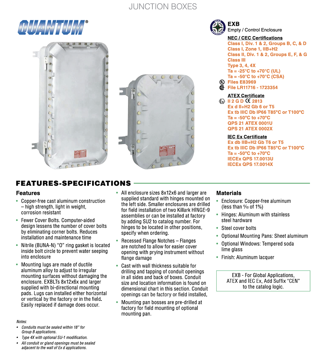The EXB explosionproof and flameproof bolted enclosure is engineered for durability and efficiency, featuring a copper-free cast aluminum construction that is both high-strength and lightweight, with exceptional corrosion resistance. Its advanced computer-aided design minimizes the number of cover bolts by eliminating corner bolts, streamlining installation and maintenance. The enclosure is also equipped with a robust gasket to ensure a secure and reliable seal.